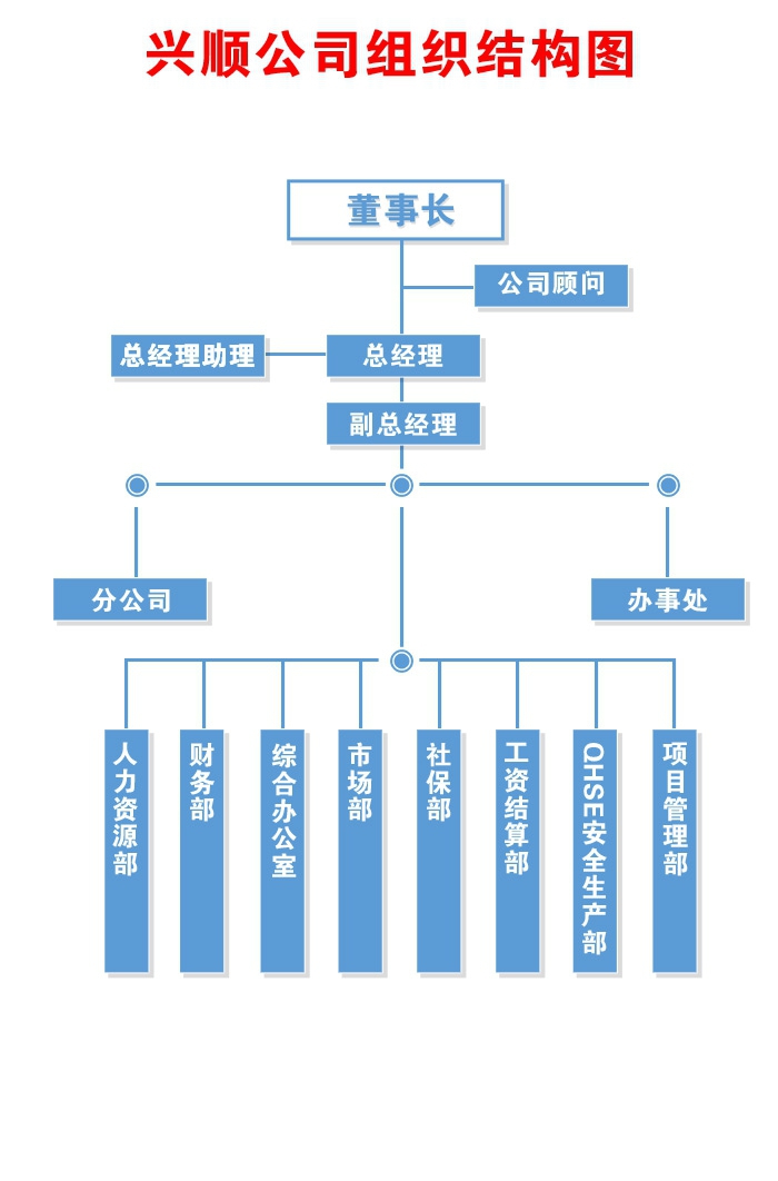 公司下設(shè)機(jī)構(gòu)有:四川興順勞務(wù)代理有限公司成都分公司、四川興順勞務(wù)代理有限公司物業(yè)服務(wù)分公司、敘永辦事處、貴陽辦事處、云南辦事處、廣西辦事處、德陽辦事處、百色辦事處、赤水辦事處、川中公管中心南充辦事處;四川金帆建筑勞務(wù)有限公司各工程項(xiàng)目部。公司內(nèi)設(shè)機(jī)構(gòu)有:公司辦公室、財(cái)務(wù)部、人力資源部、市場(chǎng)部、外包業(yè)務(wù)管理部、QHSE安全生產(chǎn)部、工資及社會(huì)保險(xiǎn)管理部、顧問辦公室等職能部門。